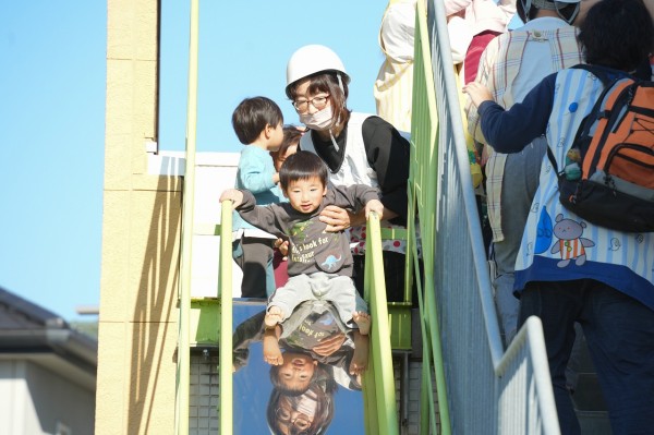 0歳児クラス、1歳児クラスのお友だちは職員に抱っこされての避難。