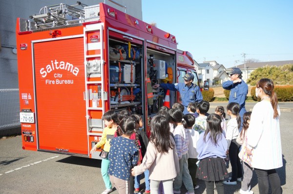 見沼消防署の消防士さんが来てくれて、消火器を使う時は「1ピン、2ホース、3レバー」と教えてくれました。