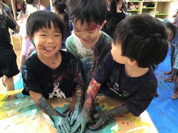 虹色の手にしたり好きな色を混ぜたりと、様々な遊び方で楽しんでいました。友達と一緒に手や足を見せ合って面白そうに笑い合っていましたよ!