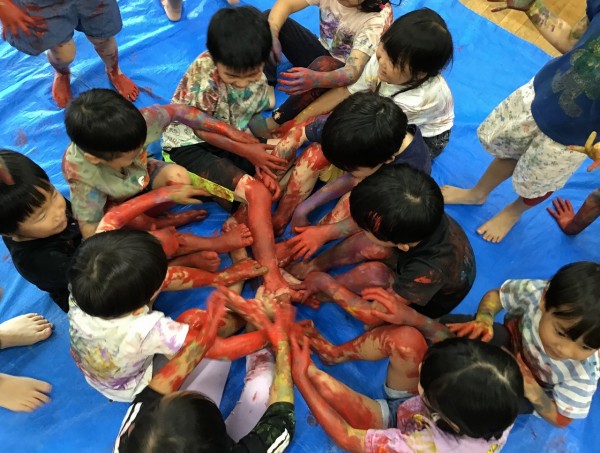 友達と手を繋いで色を混ぜ、次第に腕や足にも大胆に塗っていました!