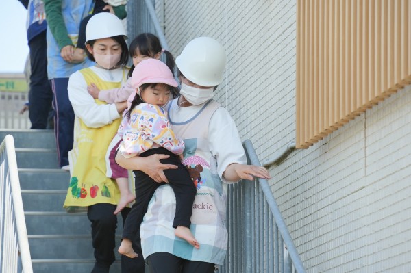 0歳児クラス、1歳児クラスのお友だちは職員に抱っこされての避難。