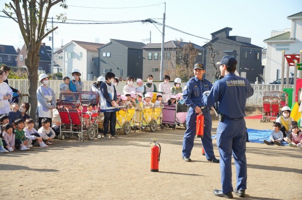 見沼消防署の消防士さんが来てくれて、消火器を使う時は「1ピン、2ホース、3レバー」と教えてくれました。